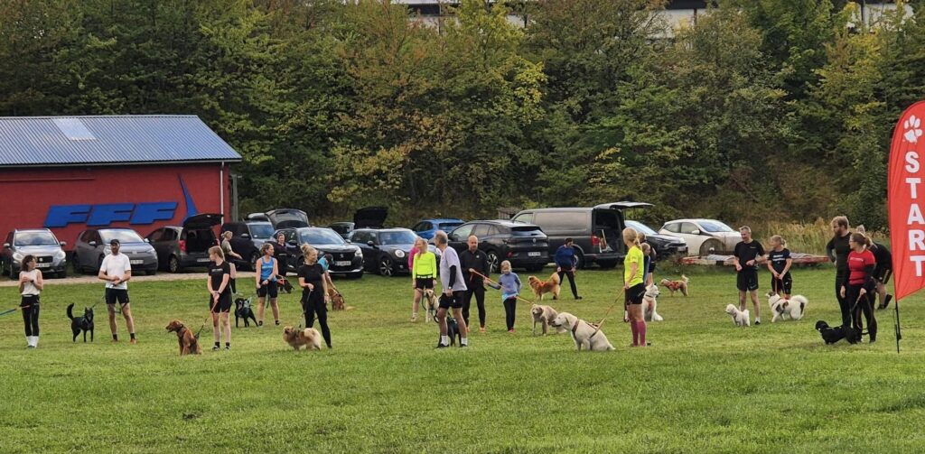 Vi var omkring 25-30 medlemmer som kom fra lokalklubber i Næstved, Køge, København og Nordsjælland. Træningen startede med fælles opvarmning og “rutegennemgang”, og så var både hunde og mennesker klar til ræs.